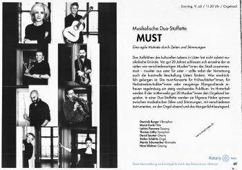 must - musiker aus uster für uster - sollte nebst der Vernetzung auch die kunstvolle Beschallung Usters fördern. Was eindrücklich gelungen ist. Die must-Konzerte für Frühaufsteher*innen, für Herbstmelancholiker*innen oder neugierige Klangsuchende erfreuen regelmässig ein stetig wachsendes Publikum. Im Hinterhalt werden 8 der mittlerweile gut 20 Musiker*innen den Orgelsaal be-spielen. In einer Duo-Staffette werden sie filigrane Fäden spinnen zwischen musikalischen Stilen und Stimmungen, mit verschiedenen Instrumenten, an der Orgel sitzend und das Morgenlicht besingend.
