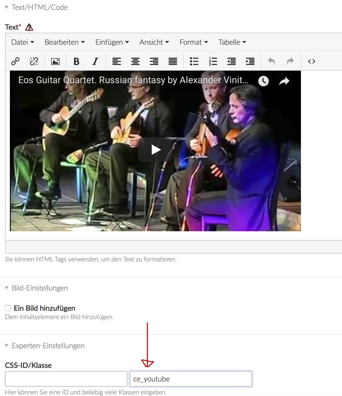 - Damit sich der Video immer korrekt responsive verhält, muss im Feld CCS «ce_youtube» eingetragen werden (sieh Bild)